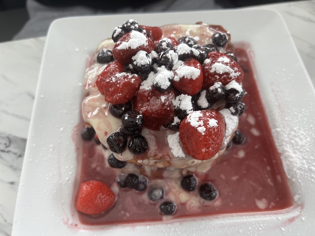 And this is where the Blueberry Strawberry Cheesecake French Toast from St. Albert’s venerable Socrates Restaurant comes in. I usually review food that I order for myself. But this past weekend was different. If there is anything watching Anthony Bourdain taught me, it’s that food journalism isn’t just about what’s on the plate, it’s about the emotions and conversations that are shared over the meal.