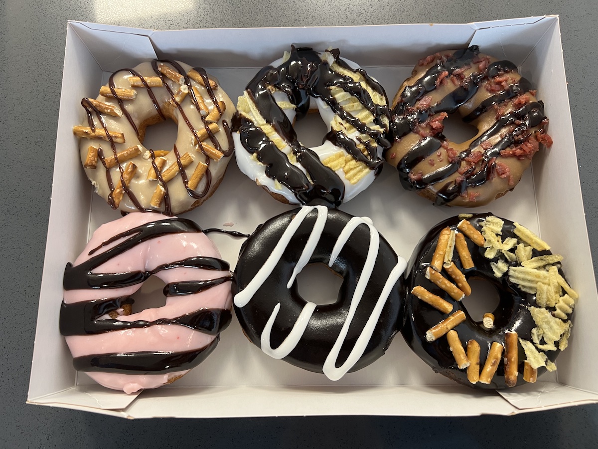 When I walk in, I see numerous icings and toppings on the counter. It would take me forever and a day to come up with six different doughnut recipes, so I go with the new Sweet and Salty Half Dozen, a new set which launched Feb. 5. Peanut butter icing. Vanilla icing. Strawberry icing. Drizzles of chocolate and marshmallow. Bacon bits. Pretzel chunks. Crushed potato chips. All of these ingredients found their way into this box of doughnuts. And they are served warm.