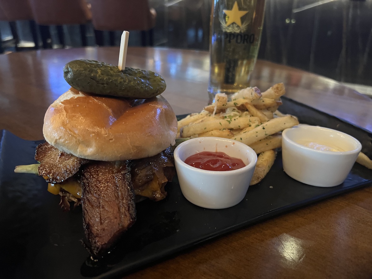 The patty is made with wagyu beef, and there are “artisan” greens, onion jam and aged cheddar on top. It’s served in a delicate brioche bun. But, wait, I left out the best part. And that’s the “billionaire” bacon. As the server brings the burger to the table, I can’t help but notice the links that stick out of the bun. Like, there’s a lot of bacon in there. For bacon to be elevated to “billionaire” status, it needs to be thick cut, and cooked with brown sugar and pepper flakes. The bacon is sweet, and, together with the onion jam, makes for a rich, rich complement to the beef. Like, over-the-top. The brioche bun cracks under the strain of everything inside, and I worry I am going to have to make the very embarrassing decision to use a fork and knife on this thing. Luckily, it holds up. Really, just one link of bacon cut this thick would be enough… but there’s so much in there, you could argue that this is a bacon sandwich with a burger patty as the condiment. In terms of bacon cheeseburgers that I’ve consumed in my life, this one goes right up near the top of the list when it comes to sheer ridiculousness.