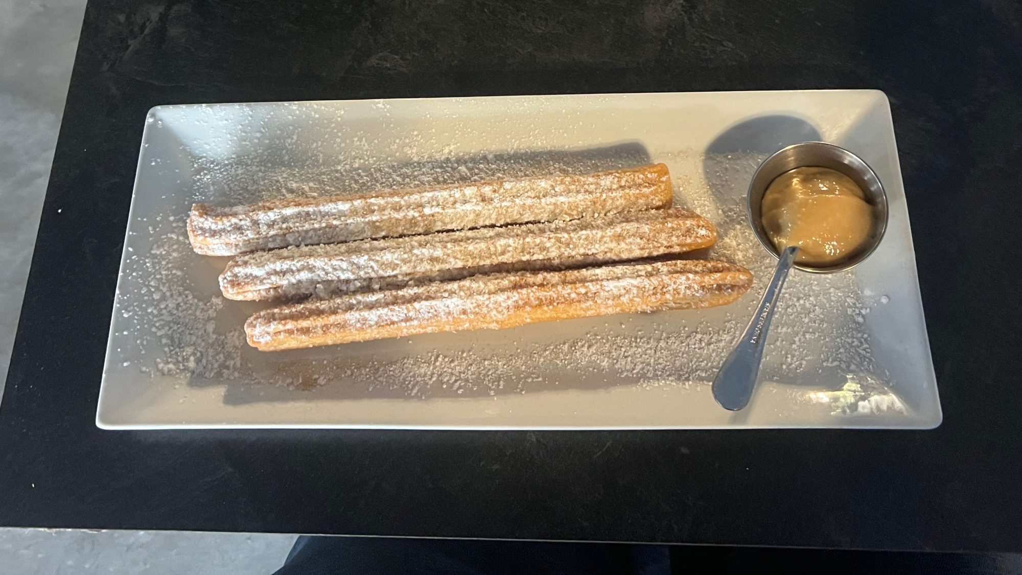 Then, come the churros, covered in powdered sugar and served with a caramel sauce. These churros aren’t as over-the-top sweet as some others I’ve had in Edmonton, and that’s a good thing. The sauce provides the big sugar kick — and putting something that’s already very sweet into a sweet sauce, that’s counterintuitive, right?