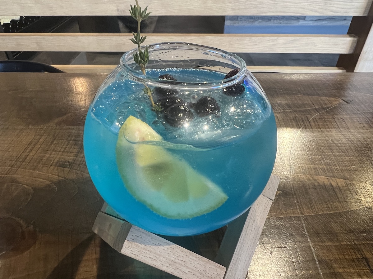 Of course there’s a cocktail menu, and, keeping with the theme, I order the Ocean Blue. It’s a concoction of blue Curacao, gin, lime juice, syrup and soda that’s pretty darn refreshing. Best part? It’s served in a fishbowl glass, which comes with its own perch. Well played, Oceania Grill, well played.